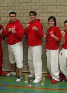 Een team van AIHATO heeft op 18 februari meegedaan aan een Tang Soo Do toernooi in Groningen. Wendy, Leon, Hafid en Aissa van AIHATO waren samen met Fouad van Bao Trieu hier naartoe gegaan. Het was een klein toernooi, maar voor de verandering wel leuk. Helaas waren alle zwarte banders bij elkaar ingedeeld, ongeacht gewicht. De jongens zaten dus allemaal bij elkaar in de poule. Jammer genoeg verloor Hafid zijn eerste ronde, maar Aissa, Fouad en Leon wonnen hun eerste partij zonder al te veel moeite. Leon als kleinste vechter had de pech om de langste tegenstander te loten, maar won de partij heel mooi. Daarna moest hij het opnemen tegen Aissa. Een leuke aparte partij, die Aissa won. Voor een plek in de finale moest Aissa tegen Fouad van Bao Trieu. Dit was echt een show partij, met zeer grappige momenten, die uiteindelijk door Aissa gewonnen werd. Aissa won ook de finale en de oude rot was het blijkbaar niet verleerd. Wendy vocht mooie partijen in de dames klasse en werd daar derde. Dit smaakte naar meer en na wat overtuiging door haar AIHATO collega’s en door haar meegereisde fanclub, besloot Wendy het ook nog te proberen in de teamsparring. Er mocht maar 1 zwarte bander in een team en Fouad vocht voor de gelegenheid in het AIHATO team. Er is er toen voor gekozen om Wendy twee keer te laten vechten per teamwedstrijd: tegen een dame en tegen een heer. Hierbij maakte ze op haar tegenstanders en op de scheidsrechters veel indruk. De prestigeprijs van het toernooi (de grootste beker) werd dan ook terecht aan Wendy toegekend ! AIHATO heeft als team veel indruk gemaakt.