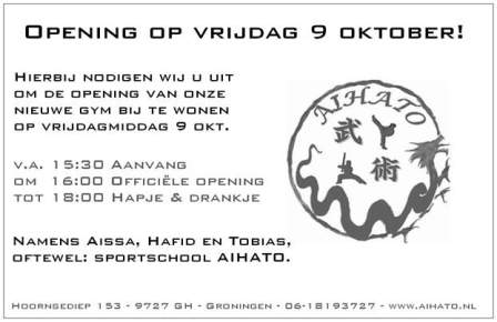Vrijdag 9 oktober is de officiele opening van AIHATO’s nieuwe gym. Van 15.30 uur tot 18.00 uur is er muziek en zijn er hapjes en drankjes. Verder zal er een leeuwendans optreden zijn en is Kickbox.tv aanwezig om opnames te maken. De officiele openingshandeling is exact om 16.00 uur.