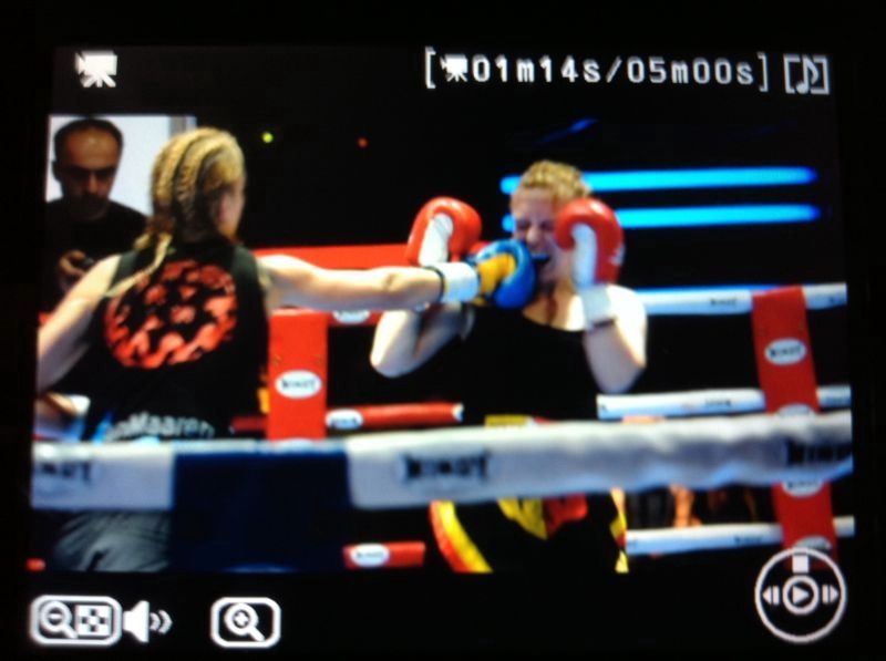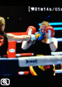 Rachel wist dat ze aan de bak moest met Sarah, die erom bekend staat vooruit te vechten en blijft komen. De strategie was dan ook om zelf in de vooruit te gaan en haar tegenstander te dwingen in de achteruit te vechten. Rachel hield zich goed aan de opdracht, werkte hard en bleef goed combineren. De partij ging de eerste 3 rondes vrij gelijk op, maar in de 4e en 5e ronde sloeg de vermoeidheid bij Sarah meer toe dan bij Rachel. Rachel wist deze partij overtuigend naar zich toe te trekken en won dan ook terecht op punten. Een mooie harde damespartij, waar Rachel 2 mooie blauwe ogen en een dikke knie aan over heeft gehouden, maar gelukkig wel met de overwinning naar huis mocht.