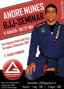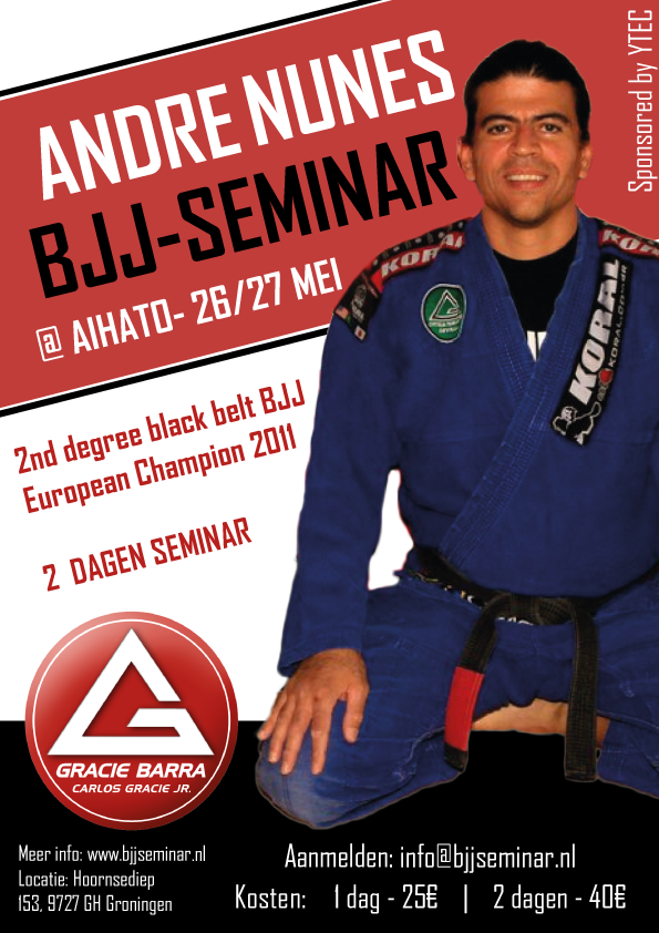 Op zaterdag 10 en zondag 11 november 2012 geeft Andre Nunes een seminar Brazilliaans Jiu Jitsu bij sportschool AIHATO. Andre Nunes is een 2e graads BJJ Black Belt, meervoudig EK medaillist en hoofd trainer van Gracie Barra Hamburg en Sevilla. Hij geeft een seminar van twee dagen bij Aihato. Dit is een buitengewoon mooie kans om met een zeer technisch onderlegde BJJ instructeur kennis van het grondwerk op te doen.