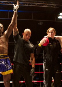 The Business Man, Bernardus van Maaren, vocht in een B-partij een rematch tegen Delain Richardson van MTC van Dams. Bernardus had eerder tegen hem gestaan en moest tegen deze jongen zijn eerste K.O incasseren, terwijl hij wel aan de winnende hand was. Genoeg reden om met spanning naar deze partij uit te kijken. Zoals we Bernardus kennen, begon hij direct druk te zetten met harde stootcombinaties. Bernardus vocht vooruit en de tegenstander probeerde achteruit vechtend toch wat punten te pakken. In de 2e ronde kwam Bernardus goed door met een hoek en kreeg zijn tegenstander de eerste 8 tellen. Daarna bleef Bernardus combineren en kwam hij daarna door met een mooie opstoot en werd zijn tegenstander uitgeteld. Een mooie overwinning op K.O.